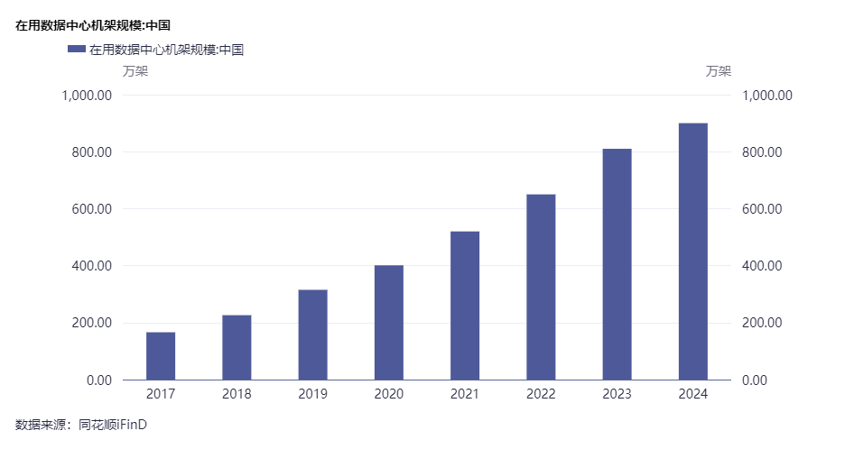 截至2024年末,我国在用数据中心机架规模已达到900万架
