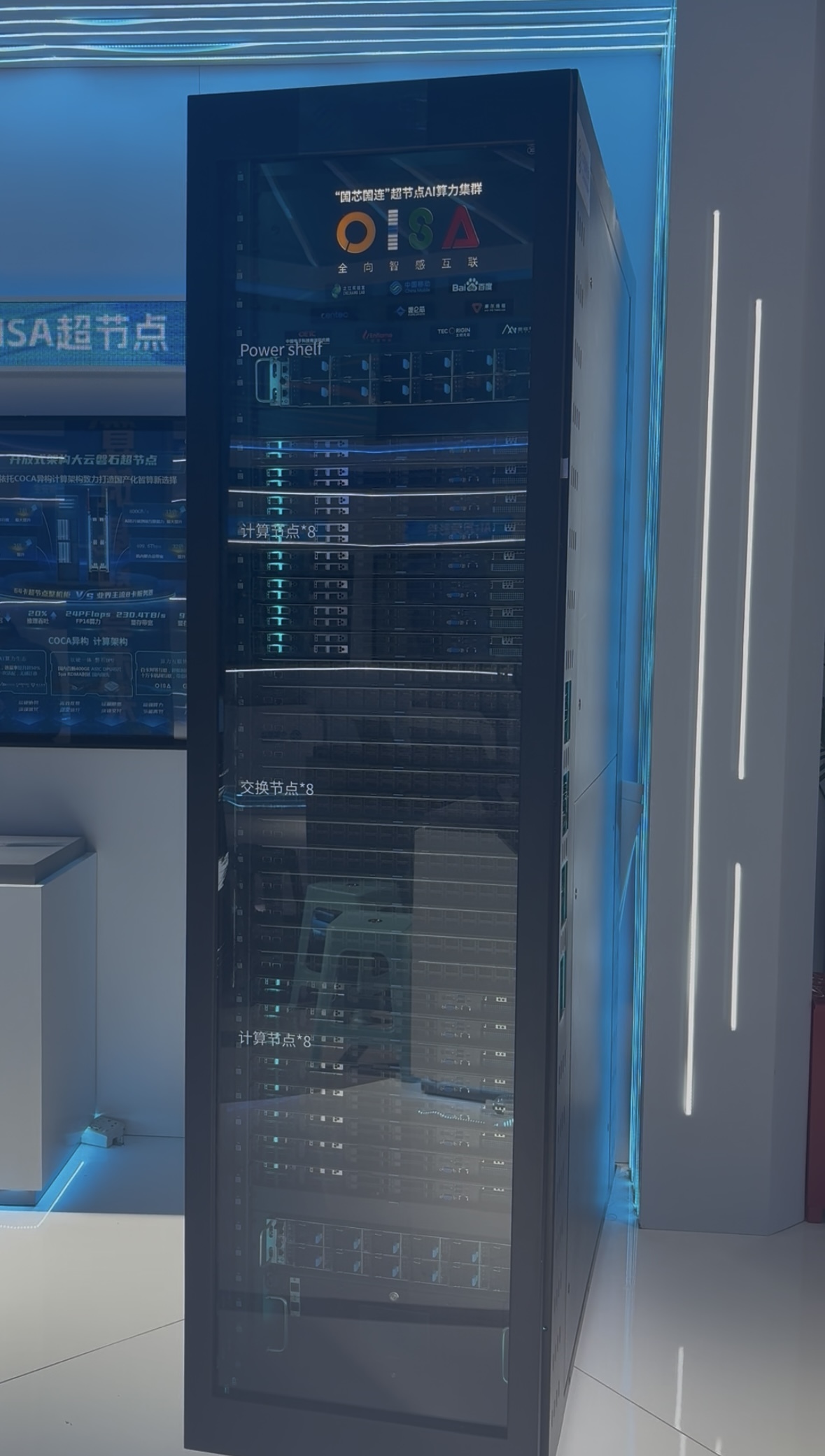 在大会算力成果展示区的中国移动展位,记者看到了带有OISA标识的“国芯国连”超节点AI算力集群的机柜。山西移动政企能力运营总监吕乐向每经记者介绍,以往一个机柜最多放三四台服务器,而这个超节点机柜能放16台服务器,每台服务器里有两颗CPU、四张国产GPU,一共64张GPU卡(AI国产芯片)。