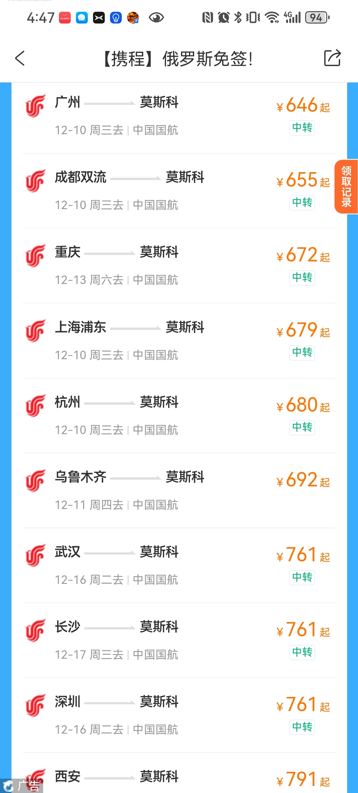 记者随机选取12月10日,在某平台搜索发现,广州飞莫斯科的国航机票价格竟然只需646元;成都飞莫斯科的机票价格为655元;上海飞莫斯科的机票价格为680元。