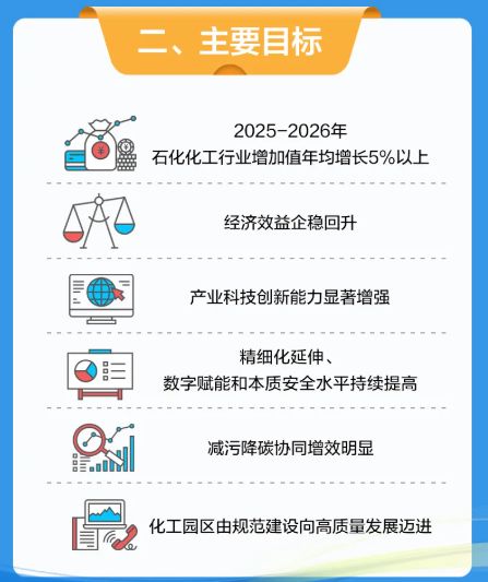 《方案》明确,2025~2026年,石化化工行业增加值年均增长5%以上,经济效益企稳回升,产业科技创新能力显著增强,精细化延伸、数字赋能和本质安全水平持续提高,减污降碳协同增效明显,化工园区由规范建设向高质量发展迈进。