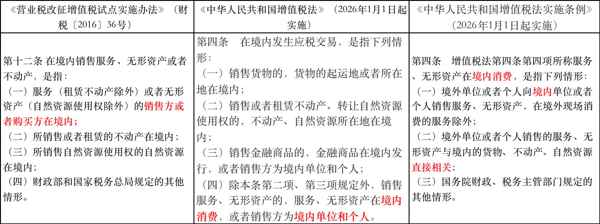 与此前的《实施办法》相比,《条例》明确“境外单位或者个人销售的服务、无形资产与境内的货物、不动产、自然资源直接相关”为“服务、无形资产在境内消费”,“境内服务”的判定删除了“购买方”判定标准。