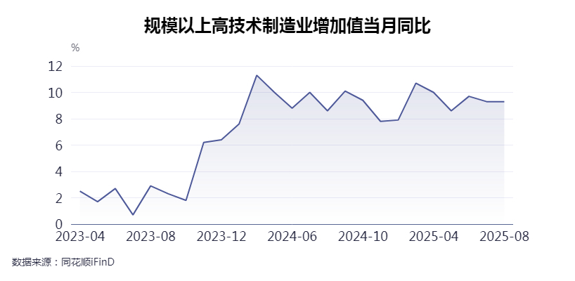 从供给侧看,生产平稳增长,制造业、服务业的重点领域增势良好。8月份,规模以上装备制造业、高技术制造业增加值同比分别增长8.1%、9.3%,比工业增加值整体增速快2.9个、4.1个百分点,集成电路、航空航天设备、工业机器人、民用无人机、新能源汽车等领域保持快速增长。