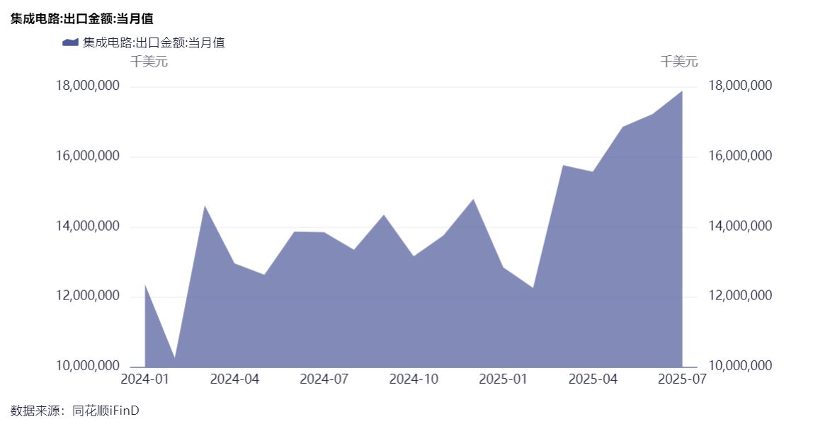 近几个月集成电路出口额大幅增长,7月当月达到高点 数据来源:同花顺iFinD