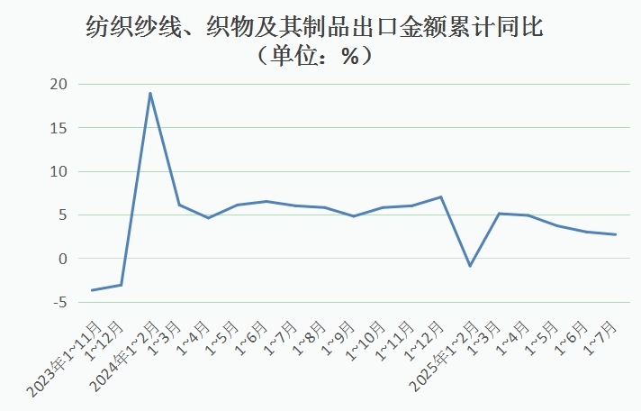 今年二季度以来纺织类产品出口额累计同比增速不断走低 数据来源:海关总署